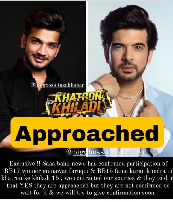 खतरों के खिलाड़ी 15 (Khatron Ke Khiladi 15) से अब तक कई पॉपुलर स्टार्स का नाम जुड़ चुका है। इनमें से कुछ ने शो का ऑफर ठुकरा दिया है। हाल ही में अभिषेक और एल्विश ने शो का हिस्सा बनने से इनकार कर दिया था। इसके बाद बिग बॉस ताजा खबर की रिपोर्ट में अपडेट शेयर किया गया है कि बिग बॉस 17 के विजेता मुनव्वर फारूकी और बिग बॉस 15 फेम करण कुंद्रा को स्टंट रियलिटी शो के 15वें सीजन के लिए अप्रोच किया गया है।