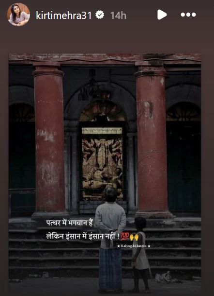 कीर्ति मेहरा जानी-मानी यूट्यूबर और फैशन इन्फ्लुएंसर हैं। वह सोशल मीडिया पर काफी एक्टिव रहती हैं। हाल ही में, एल्विश यादव के जेल जाने के बीच कीर्ति ने एक क्रिप्टिक पोस्ट शेयर किया है, जिसे देख लोग मान रहे हैं कि वह अपने एक्स ब्वॉयफ्रेंड को हिम्मत दे रही हैं। कीर्ति ने इंस्टाग्राम स्टोरी पर एक क्वोट शेयर किया है, जिसमें कहा गया है, "गीता में लिखा है- कमजोर तेरा वक्त है, तू नहीं।"