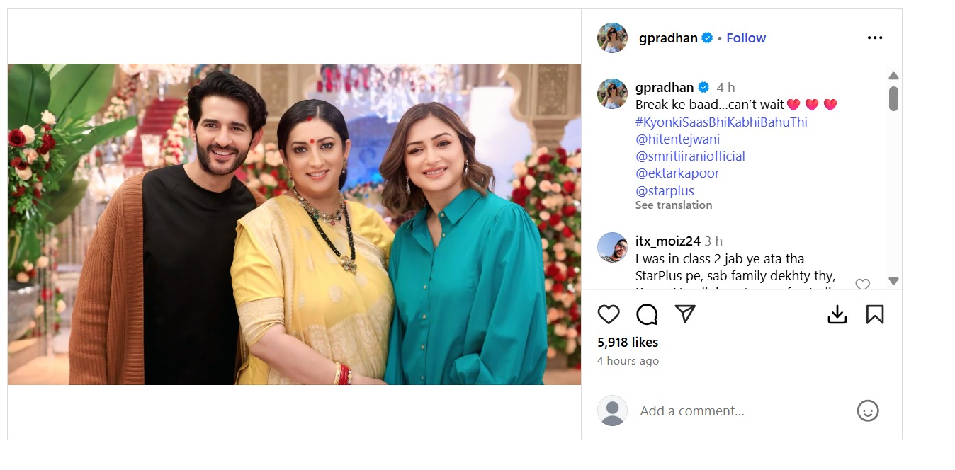 गौरी प्रधान की पोस्ट में उनके पति और को-एक्टर हितेन तेजवानी और प्रतिष्ठित तुलसी यानी स्मृति ईरानी के साथ पर्दे के पीछे के एक खुशनुमा पल को दिखाया गया है। यह तस्वीर उत्साह से भरी है और इस शो के समृद्ध सांस्कृतिक सार की ओर इशारा करती है। उत्साह से भरे कैप्शन में उन्होंने लिखा,"ब्रेक के बाद... इंतजार नहीं हो रहा, क्योंकि सास भी कभी बहू थी।" यह शो के फिर से शुरू होने की उत्सुकता को दर्शाता है।