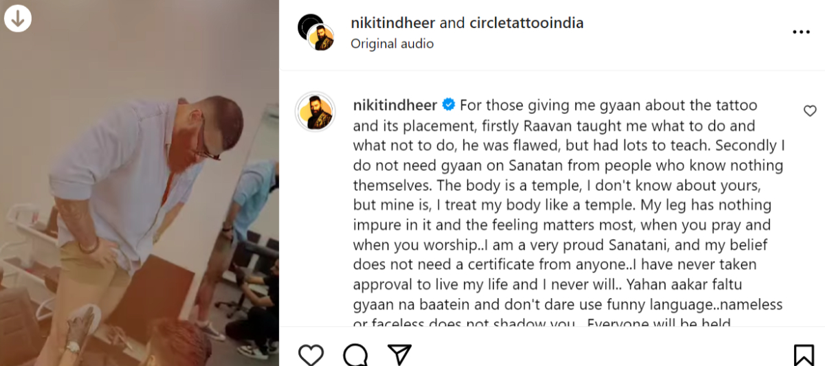 जिन लोगों ने निकितिन को ट्रोल किया, उन्हें एक्टर ने वहीं करारा जवाब दिया। निकितिन ने रिप्लाई में लिखा- जो लोग मुझे टैटू की जगह को लेकर ज्ञान दे रहे हैं, सबसे पहले उन्हें बता दूं कि रावण ने मुझे सिखाया है, क्या करना चाहिए क्या नहीं। उसमें दोष था, लेकिन सीखने के लिए भी बहुत कुछ था।