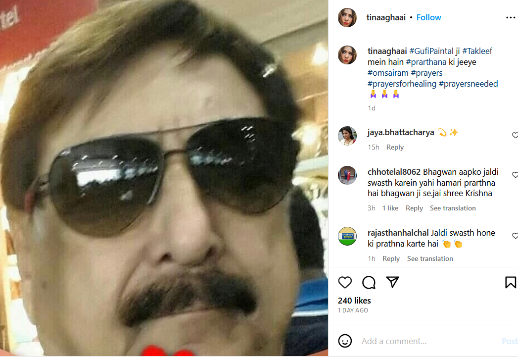 टीना ने गूफी की एक तस्वीर शेयर करते हुए कैप्शन में लिखा है, "गूफी पेंटल जी तकलीफ में हैं। प्रार्थना कीजिए। ओम साई राम प्रेयर्स, प्रेयर्स फॉर हीलिंग, प्रेयर्स नीडेड।" टीना के इस पोस्ट से गूफी की हालत को लेकर फैंस काफी चिंता में आ गए हैं। इस पोस्ट पर कमेंट कर तमाम फैंस कमेंट बॉक्स में वेटरन एक्टर के ठीक होने की दुआ कर रहे हैं।