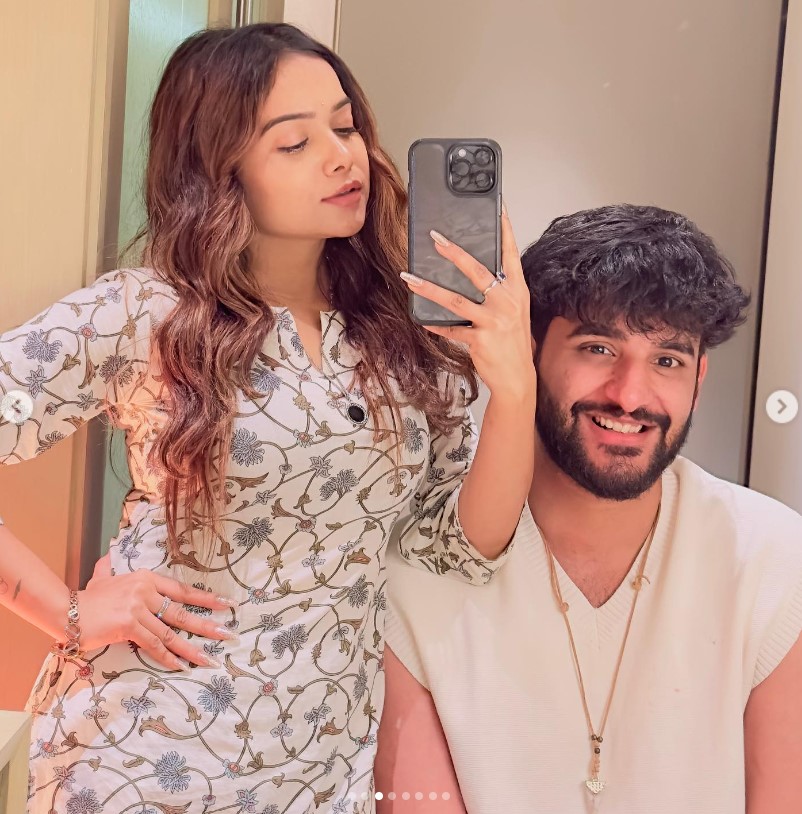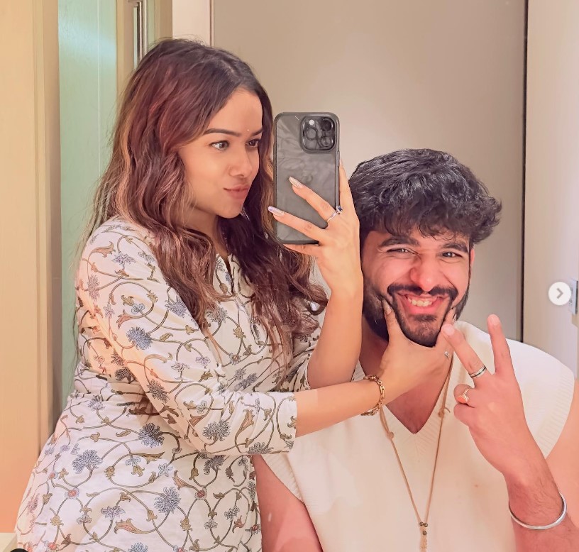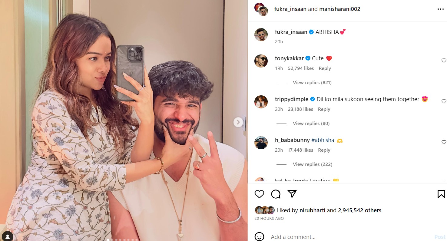 इन तस्वीरों में अभिषेक मल्हान और मनीषा रानी मिरर सेल्फी लेते नजर आ रहे हैं। जहां मनीषा ने हमेशा की तरह इंडियन अटायर में अपनी खूबसूरती फ्लॉन्ट की, वहीं अभिषेक ने कैजुअल लुक में फोटो क्लिक कराई। फोटो में इनकी जोड़ी फैंस को बहुत क्यूट लग रही है। मनीषा ने इन तस्वीरों को 'अभिशा' कैप्शन के साथ शेयर किया है।