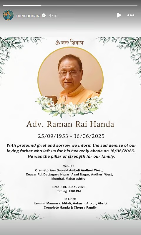 एक्ट्रेस मनारा चोपड़ा ने इस मुश्किल घड़ी में पिता के निधन की जानकारी फैंस को सोशल मीडिया प्लेटफॉर्म इंस्टाग्राम के जरिए दी। अपनी पोस्ट में एक्ट्रेस ने लिखा, 'बहुत दुख और पीड़ा के साथ हम अपने प्यारे पिता के दुखद निधन की सूचना देते हैं, जो 16/06/2025 को हमें छोड़कर चले गए।'