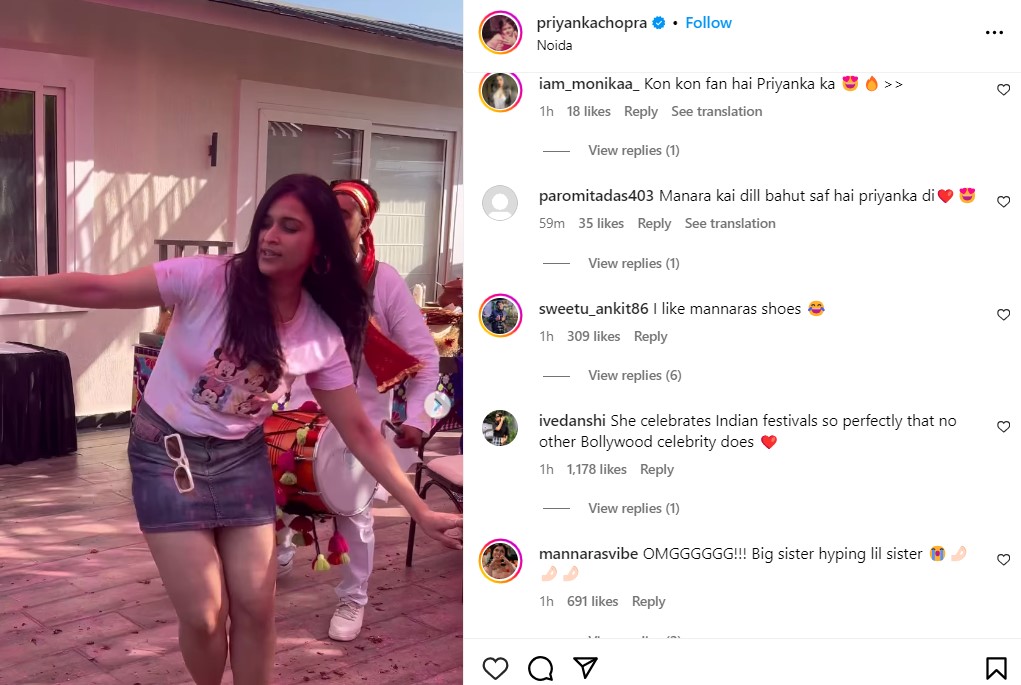 प्रियंका चोपड़ा के इस वीडियो पर मनारा चोपड़ा के लिए कई कमेंट्स भी आए। एक यूजर ने कहा, "मनारा का दिल बहुत साफ है प्रियंका दी।" एक अन्य यूजर ने कहा, "मुझे मनारा के जूते पसंद आए।"
