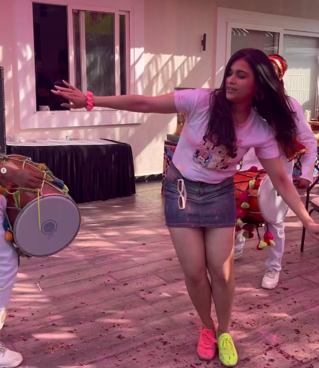 प्रियंका चोपड़ा और निक जोनस की पार्टी में मनारा चोपड़ा जमकर होली एंजॉय करते हुए नजर आईं। हालांकि, पीसी ने सिर्फ एक झलक शेयर की है। होली पार्टी के इस वीडियो में मनारा चोपड़ा ढोल के बीच मगन होकर डांस करते हुए दिखाई दे रही हैं। व्हाइट टी-शर्ट, डेनिम मिनी स्कर्ट और रंग बिरंगे जूते पहने मनारा चोपड़ा फुल होली वाले लुक में लग रही हैं।