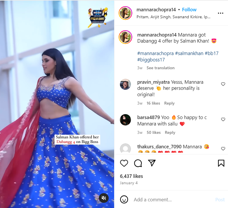मनारा चोपड़ा की वाइब फैंस के साथ-साथ बिग बॉस सीजन 17 में खुद बिग बॉस और शो के होस्ट सलमान खान को ही खूब भाई। अब हाल ही में मनारा चोपड़ा के एक फैन क्लब ने अपने इंस्टाग्राम पर एक पोस्ट शेयर करते हुए ये दावा किया है कि 'जिद' एक्ट्रेस को सलमान खान ने अपनी सबसे बड़ी फ्रेंचाइजी में से एक 'दबंग-4' ऑफर की है।