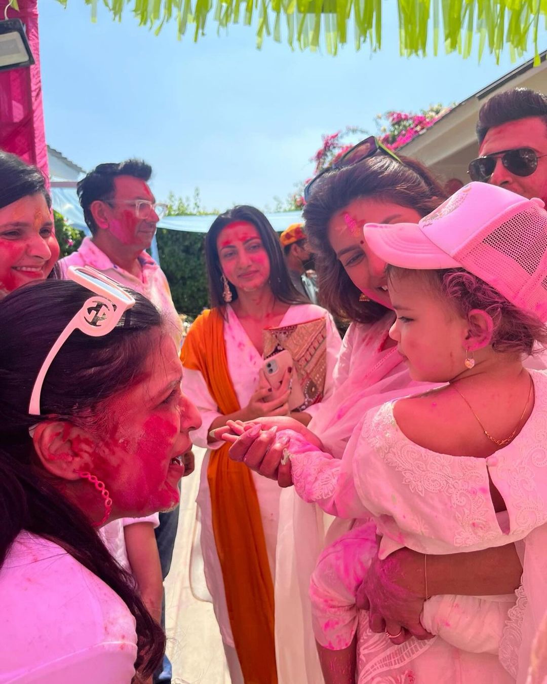 मनारा चोपड़ा ने एक वीडियो अपना डांस करते हुए भी पोस्ट किया। एक्ट्रेस के पोस्ट की सबसे प्यारी फोटो मालती के साथ वाली है। तस्वीर में मालती हाथों में रंग लिए प्रियंका चोपड़ा की गोद में बैठी हुई हैं और मनारा चोपड़ा को देख रही हैं। पार्टी में जाने से पहले मनारा ने घर में भगवान के साथ होली खेली। एक्ट्रेस ने अपना पूजा करते हुए वीडियो भी फैंस के लिए शेयर किया है।