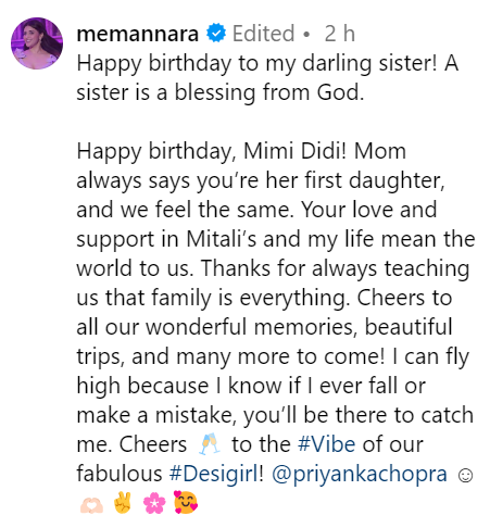 इसके आगे उन्होंने लिखा कि जन्मदिन की बधाई, मिमी दीदी। मां हमेशा कहती हैं कि तुम उनकी पहली बेटी हो और हम भी ऐसा ही महसूस करते हैं। मिताली और मेरी लाइफ में आपका प्यार और समर्थन हमारे लिए बहुत मायने रखता है। हमें हमेशा यह सिखाने के लिए धन्यवाद कि परिवार ही सब कुछ है।
