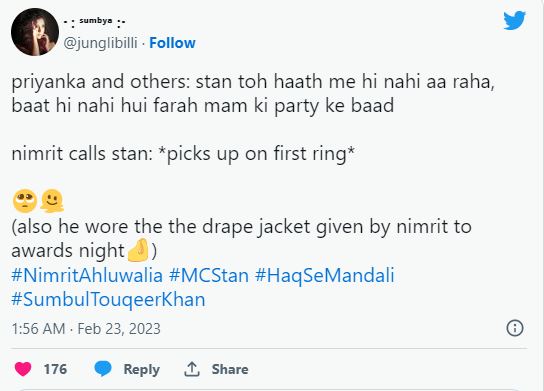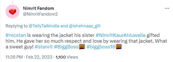 फैंस को मंडली की ये बॉन्डिंग काफी पसंद आई। एक यूजर ने कमेंट करते हुए लिखा, 'वाऊ एमसी स्टैन ने निमृत की जैकेट पहनी है, लव यू ब्रो'। दूसरे यूजर ने लिखा, 'एमसी स्टैन ने अपनी बहन निमृत की दी हुई जैकेट पहनी है।