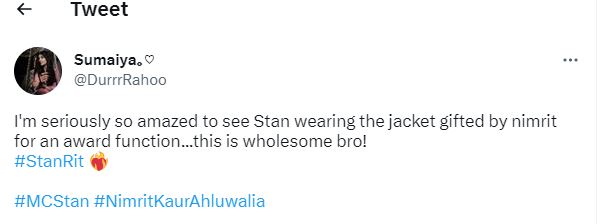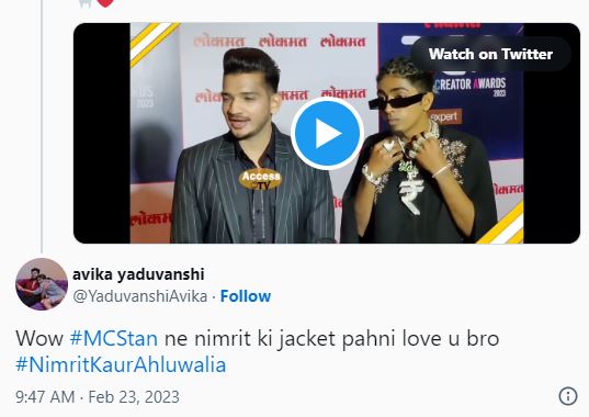 आपको बता दें कि एमसी स्टैन ने जो जैकेट पहनी थी, वह उन्हें निमृत कौर अहलूवालिया ने बिग बॉस के घर में गिफ्ट की थी। वह इसे एक बार घर में भी पहन चुके हैं। आपको बता दें कि बिग बॉस खत्म होने के बाद एमसी स्टैन पहली बार किसी अवॉर्ड नाइट में नजर आए और इस दिन के लिए उन्होंने निमृत की जैकेट पहनी।