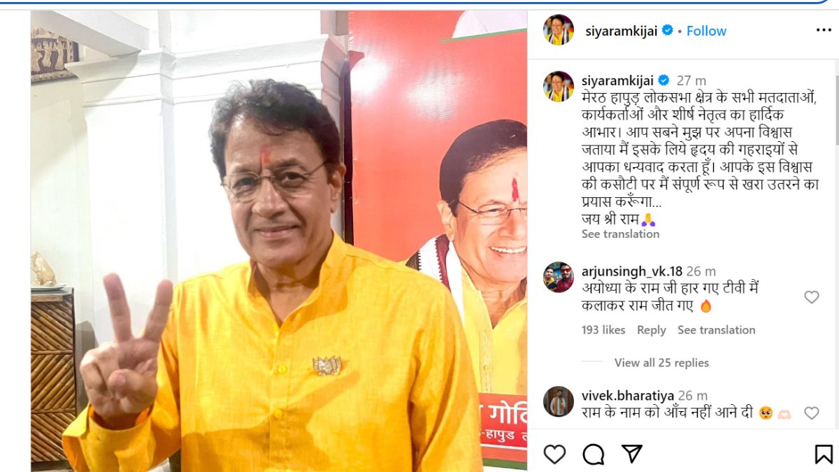 जीत के बाद अरुण गोविल ने अपने ऑफिशियल इंस्टाग्राम हैंडल पर विक्ट्री साइन के साथ लेटेस्ट फोटो को साझा किया है। इसके साथ उन्होंने कैप्शन में लिखा है- मेरठ-हापुड़ लोकसभा क्षेत्र के सभी मतदाओं, कार्यकर्ताओं और शीर्ष नेतृत्व का हार्दिक आभार व्यक्त करता हूं।