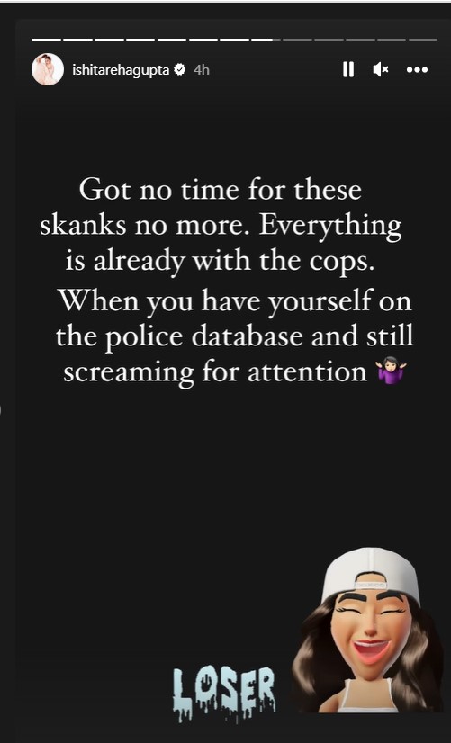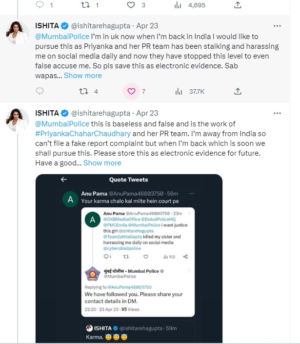 प्रियंका और उनकी टीम पर परेशान करने के आरोप में इशिता ने मुंबई पुलिस में कंप्लेन दर्ज कराई है। उन्होंने सोशल मीडिया प्लेटफॉर्म इंस्टाग्राम पर लिखा, ''मेरे पास इस तरह की बेकार की बातों के लिए वक्त नहीं है। सारा डेटाबेस पुलिस के पास है, और उसके बाद भी आप अटेंशन के लिए परेशान हैं।''