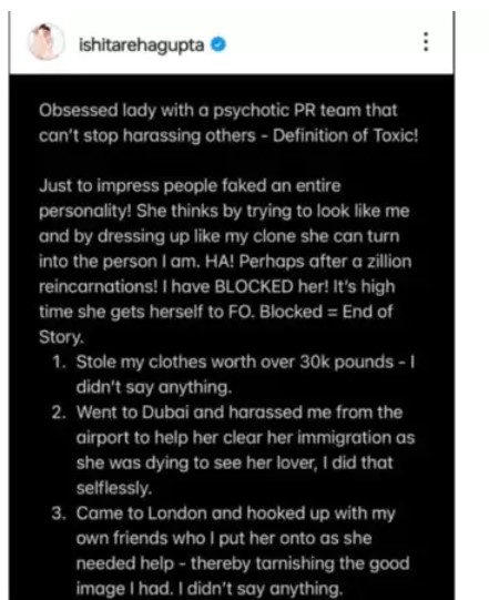 कुछ दिन पहले उन्होंने एक पोस्ट किया, 'वो महिला एक पीआर टीम के साथ दूसरों को परेशान करना बंद नहीं कर सकती। सिर्फ लोगों को इम्प्रेस करने के लिए अच्छा बनने का नाटक किया। उसे लगता है कि मेरी तरह तैयार होकर वह मेरे जैसी हो जाएगी। मेरे 30 हजार पाउंड से ज्यादा के कपड़े चुराए, मैंने कुछ नहीं कहा।'