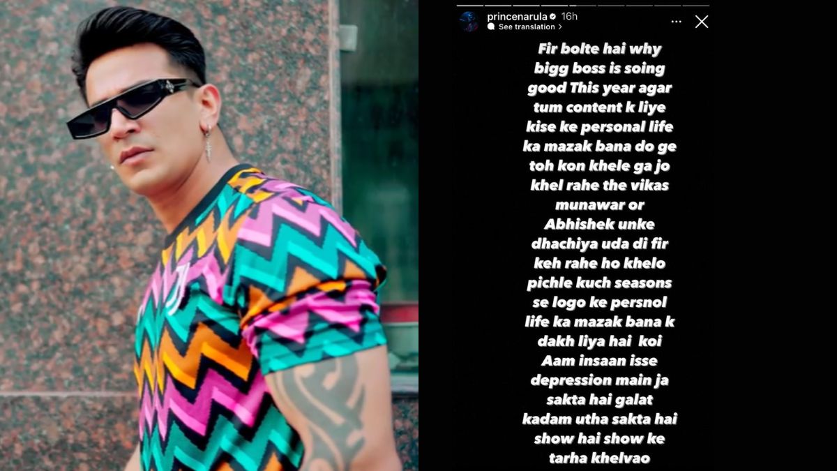 प्रिंस ने अपने ऑफिशियल इंस्टाग्राम हैंडल पर स्टोरी में लिखा है- ''फिर बोलते हो कि इस साल बिग बॉस काफी अच्छा जा रहा है। तुम कंटेट के लिए किसी की पर्सनल लाइफ का मजाक बना दोगे तो कौन खेलेगा। जो खेल रहे थे विकास, मुनव्वर और अभिषेक उनकी धज्जियां उड़ा दीं और फिर कह रहे हो कि खेलो। पिछले कुछ सीजन से लोगों की निजी जिंदगी का मजाक बनते हुए देख लिया है।