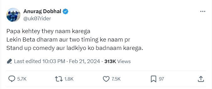 अनुराग डोभाल ने अपने आधिकारिक एक्स अकाउंट पर बिना नाम लिए मुनव्वर फारुकी को लेकर कहा, "पापा कहते थे नाम करेगा, लेकिन बेटा धर्म और टू टाइमिंग के नाम पर स्टैंड- अप कॉमेडी और लड़कियों को बदनाम करेगा।"