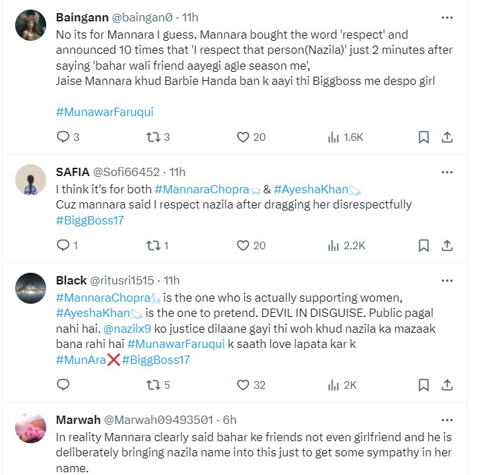 एक ने लिखा, 'ये आयशा के लिए ही है, जो मुनव्वर के नाम पर फुटेज ले रही है।' वहीं, एक यूजर ने कमेंट किया, 'नहीं ये मनारा के लिए है। मनारा ने नाजिला के लिए कम से कम 10 बार रिस्पेक्ट शब्द का इस्तेमाल किया और उन्हें नाजिला को 'बाहरी दोस्त' बोलने पर दो मिनट भी नहीं लगा। जैसे मनारा खुद बार्बी हांडा बनकर आई थी बिग बॉस में डेस्पो लड़की।'
