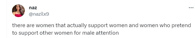 नाजिला ने लिखा, 'कुछ महिलाएं होती हैं, जो असल में महिलाओं को सपोर्ट करती हैं और कुछ होती हैं, जो दूसरी महिलाओं को सिर्फ मेल अटेंशन के लिए सपोर्ट करती हैं।'