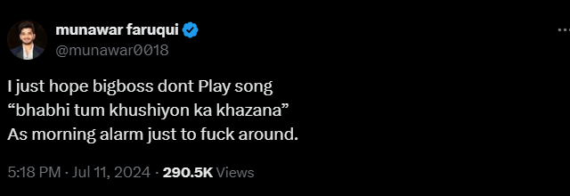 अब बिग बॉस ओटीटी 3 में हुए इस बड़े झगड़े पर मुनव्वर फारूकी (Munawar Faruqui) ने बिना नाम लिए अरमान मलिक और उनकी पत्नी कृतिका पर निशाना साधा है। उन्होंने अपने आधिकारिक एक्स अकाउंट पर लिखा, "मैं उम्मीद करता हूं कि बिग बॉस कहीं अब सुबह के अलार्म के तौर पर गाना ना बजा दें कि भाभी तुम खुशियों का खजाना"।