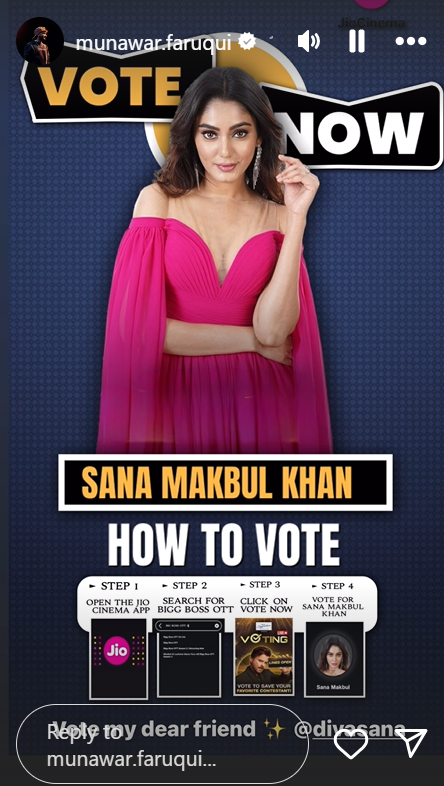 अब मुनव्वर ने अपने पसंदीदा कंटेस्टेंट के लिए फैंस से वोट की अपील की है। बता दें कि उनका पसंदीदा कंटेस्टेंट नैजी नहीं, बल्कि सना मकबूल हैं। उन्होंने अपने इंस्टाग्राम पर एक पोस्ट किया है, जिसमें उन्होंने अपने फैंस से उनके लिए वोट्स की डिमांड की है।