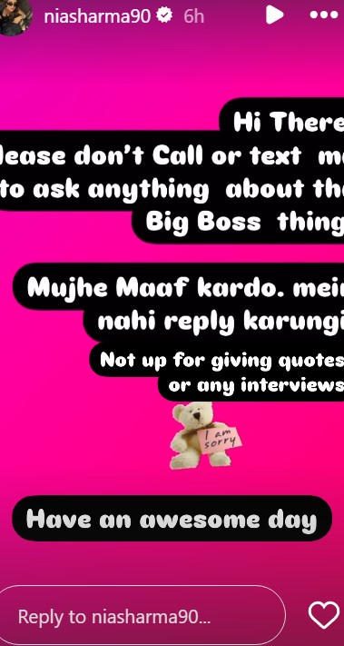 निया ने इंस्टाग्राम स्टोरी पर लिखा, 'मुझसे बिग बॉस के बारे में कुछ भी पूछने के लिए मुझे कॉल या मैसेज मत करिये। मुझे माफ कर दो। मैं रिप्लाई नहीं करूंगी। मैं किसी तरह का इंटरव्यू फिलहाल नहीं देना चाहूंगी।'