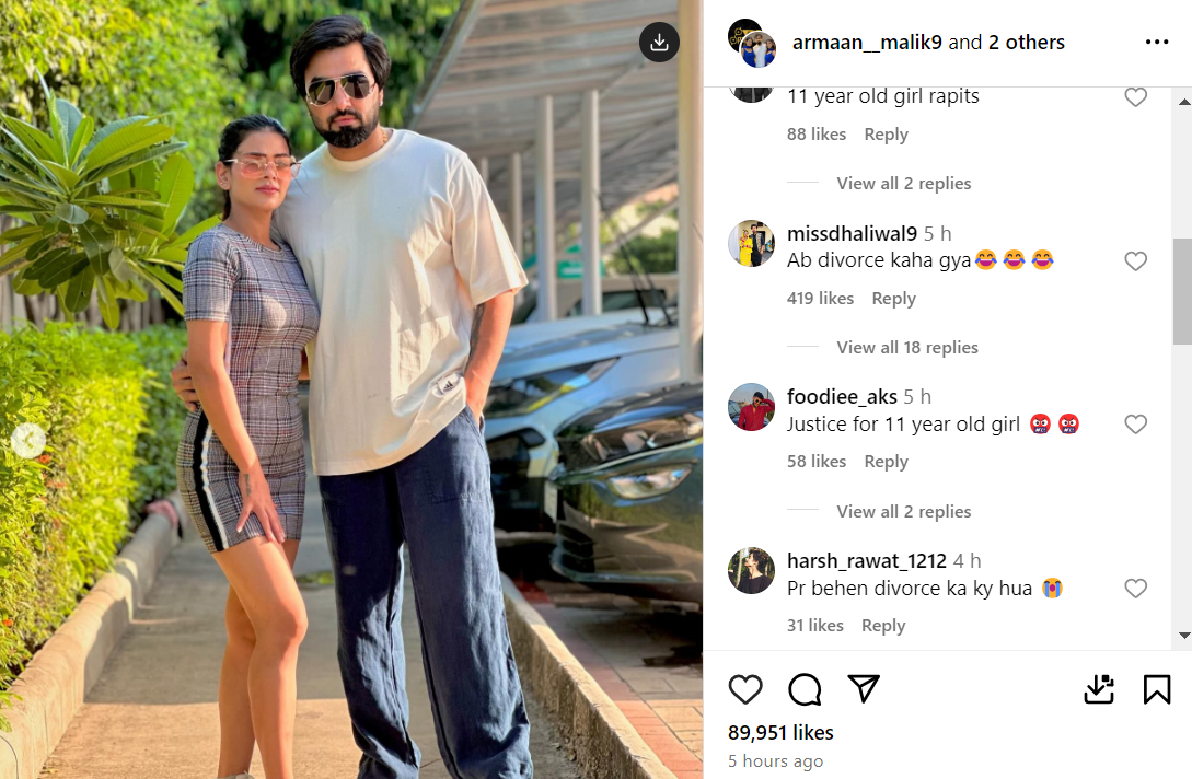 पायल की ये तस्वीरें देखकर फैंस भड़क गए और कमेंट सेक्शन में अपना गुस्सा निकालने लगे। फैंस ने डिवोर्स वाली बात पर कमेंट करते हुए पूछा, 'अब क्या हुआ? एक दूसरे यूजन ने कमेंट किया- 'अब डिवार्स कहां गया? एक अन्य ने कमेंट किया- 'क्या हुआ पायल तो डिवार्स देने वाली थी अरमान को।'
