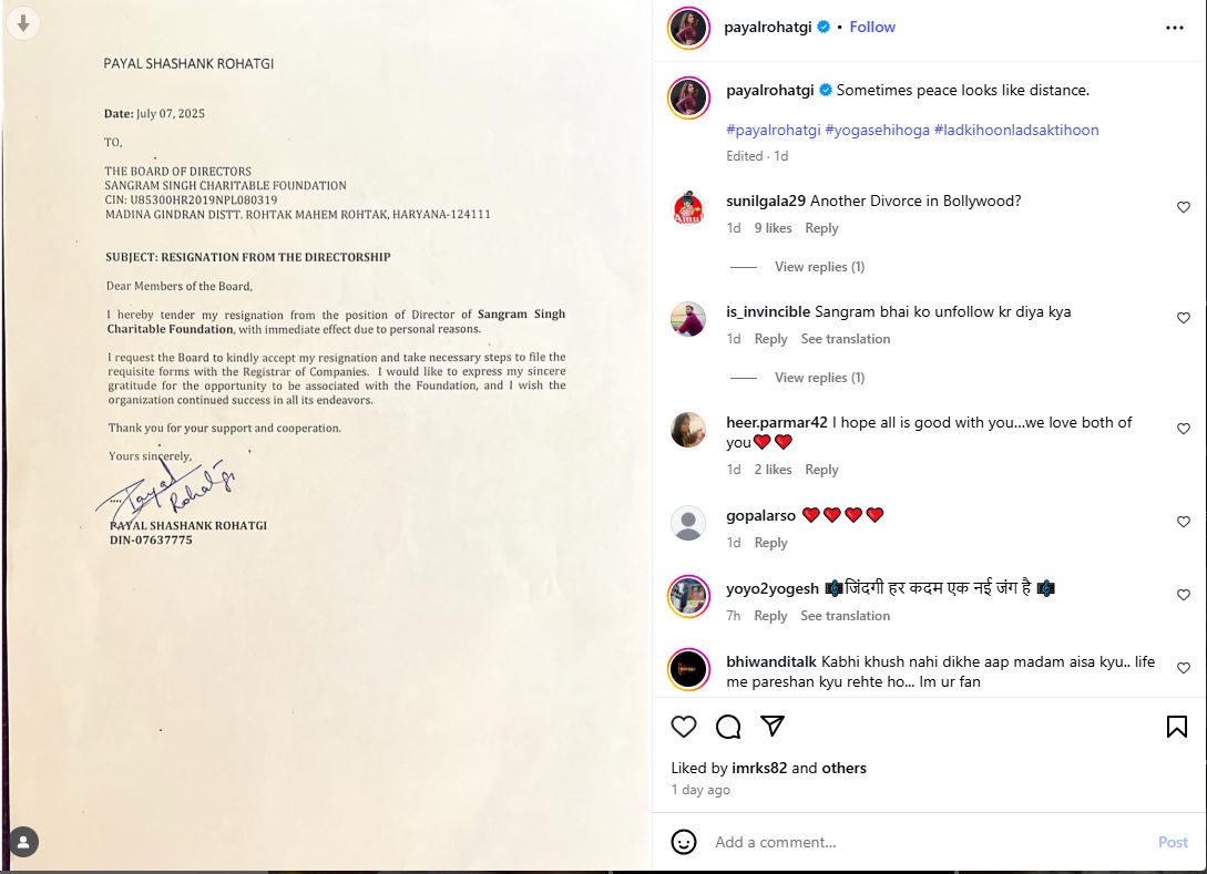 दरअसल, 'ढोल' फिल्म एक्ट्रेस ने बीते दिन अपने आधिकारिक इंस्टाग्राम पर एक स्टेटमेंट जारी किया था, जिसमें उन्होंने बताया था कि वह संग्राम सिंह चेरिटेबल फाउंडेशन के चेयरपर्सन के रूप में रिजाइन कर रही हैं। ये पोस्ट तक तो ठीक था, लेकिन पायल ने जो कैप्शन में लिखा, उससे सोशल मीडिया पर फैंस ये अंदाजा लगाने लगे कि टीवी की दुनिया में एक और तलाक हो रहा है। पायल ने लिखा था, "कभी-कभी शांति दूरियों में होती है"।
