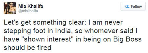 नई दिल्ली। पिछले कुछ दिनों से रियलिटी शो 'बिग बॉस' में पॉर्न स्टार मिया खलीफा के हिस्सा लेने की जोर-शोर से चर्चा थी। इन चर्चाओं के बीच उनका इंस्टाग्राम अकाउंट हैक होने की खबर भी सामने आ गई। खैर, अब उन्होंने खुद ट्वीट कर साफ कर दिया है कि वो न तो भारत आ रही हैं और ना ही 'बिग बॉस' में हिस्सा ले रही हैं।