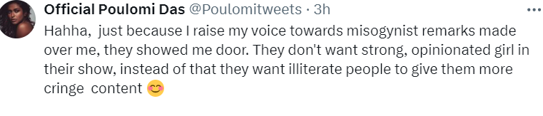अब उन्होंने अपने सोशल मीडिया हैंडल एक्स पर एक वीडियो शेयर किया है और इसमें उन्होंने अपनी एग्जिट की क्लिप शेयर करते हुए बिग बॉस पर भड़ास निकाली है। पौलोमी ने वीडियो शेयर करते हुए लिखा कि हाहाहा, सिर्फ इसलिए कि मैंने अपने ऊपर की गई महिला विरोधी टिप्पणियों के खिलाफ आवाज उठाई, उन्होंने मेरे लिए दरवाजा दिया। वे अपने शो में मजबूत राय रखने वाली लड़की नहीं चाहते, इसके बजाय वे चाहते हैं कि अनपढ़ लोग उन्हें और ज्यादा शर्मनाक कंटेंट दें।
