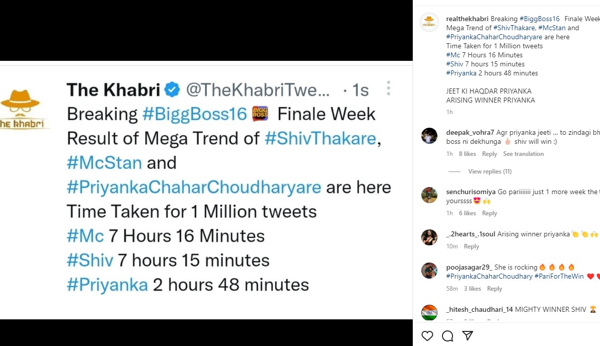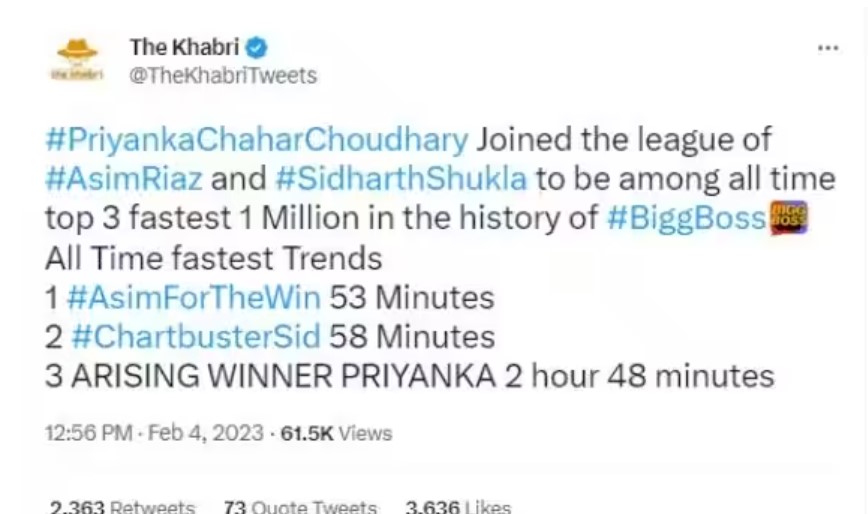 सिर्फ इतना ही नहीं बल्कि टि्वटर हैंडल द खबरी ने बिग बॉस 16 के फिनाले का प्रेडिक्शन भी किया। स्पेस में कंटेस्टेंट की रैंकिंग के अनुसार बताया कि किसके चांसेस ज्यादा है इस शो को जीतने के लिए। ट्वीट के अनुसार प्रियंका जाट चौधरी को विनर बताया गया है। शिव ठाकरे रनर अप होंगे और एमसी स्टैन सेकेंड रनर अप।