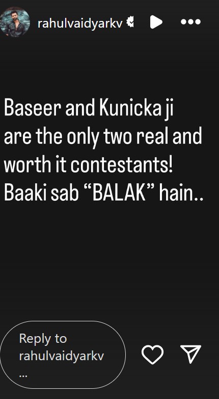 अपनी स्टोरी में राहुल ने लिखा, 'बिग बॉस 19 = किंडरगार्टन'। एक और स्टोरी में, राहुल ने इस सीजन के दो कंटेस्टेंट्स के नाम बताए जो उन्हें रियल लगते हैं- बसीर अली और कुनिका सदानंद। उन्होंने लिखा, 'बसीर और कुनिका जी ही दो असली और काबिल कंटेस्टेंट हैं! बाकी सब 'बालक' हैं..", जिससे साफ जाहिर होता है कि उन्हें बाकी घरवाले कुछ खास पसंद नहीं आए। राहुल के इस बेबाक आकलन ने फैन्स की दिलचस्पी बढ़ा दी है और मौजूदा सीजन के कंटेस्टेंट्स की क्वालिटी को लेकर ऑनलाइन नए विवाद शुरू हो गए हैं।