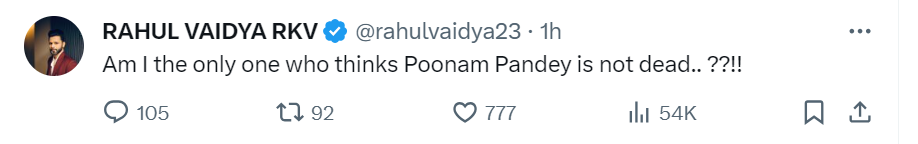 हालांकि पूनम पांडे के निधन को लेकर कई तरह के और भी दावे किए जा रहे हैं। इस बीच राहुल वैद्य ने अपने ऑफिशियल एक्स हैंडल पर एक लेटेस्ट ट्वीट किया है। इस ट्वीट में राहुल ने लिखा है- क्या मैं अकेला हूं जो सोच ये रहा हूं कि पूनम पांडे मरी नहीं हैं।