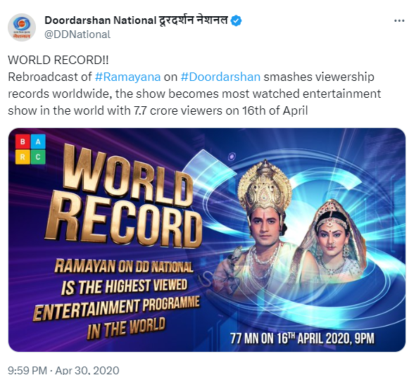 'रामायण' ने लॉकडाउन में ऑनएयर होने वाले अन्य सभी टीवी शोज के रिकॉर्ड तोड़ दिए थे। रामानंद सागर के निर्देशन में बनी अरुण गोविल और दीपिका चिखलिया स्टारर 'रामायण' को लॉकडाउन में दोबारा प्रसारित करने पर 16 अप्रैल तक इस शो को 77 मिलियन से ज्यादा व्यूवरशिप मिली थी, जिसकी जानकारी खुद डीडी नेशनल ने अपने एक्स अकाउंट (Twitter)पर शेयर की थी।