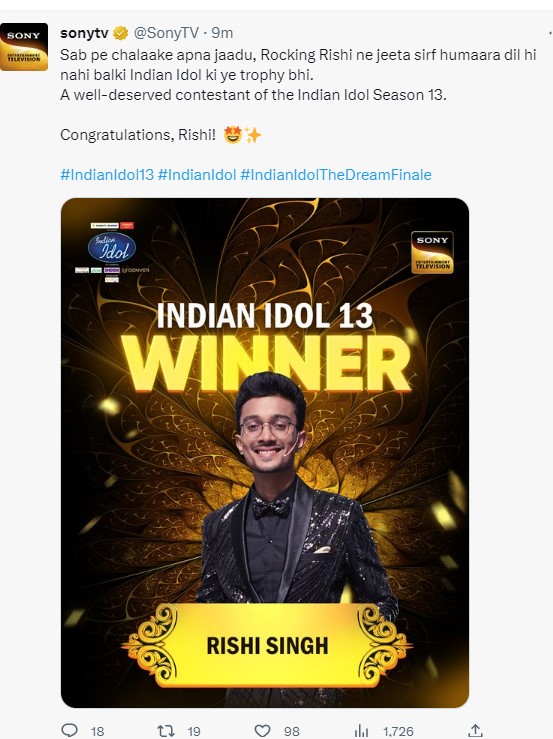 नई दिल्ली, जेएनएन। Indian Idol 13 Winner: सिंगिंग की दुनिया के फेमस रियलिटी शो 'इंडियन आइडल' ने देश को अब तक 12 बेहतरीन सिंगर्स दिए हैं, और अब 13वां विनर भी दर्शकों के सामने है। कई महीनों तक अपनी सुरीली आवाज से ऑडियंस को मंत्रमुग्ध कर देने वाले कंटेस्टेंट्स के बीच फिनाले में कांटे की टक्कर देखने को मिली। इस बीच यह शो कई वजहों से सुर्खियों में रहा। मगर उतार चढ़ाव के बीच फाइनली यह शो ग्रैंड फिनाले तक पहुंच गया और सीजन 13 को उसका विनर मिल चुका है। इंडियन आइडल 13 के विनर की ट्रॉफी अयोध्या के रहने वाले ऋषि सिंह ने जीती है।