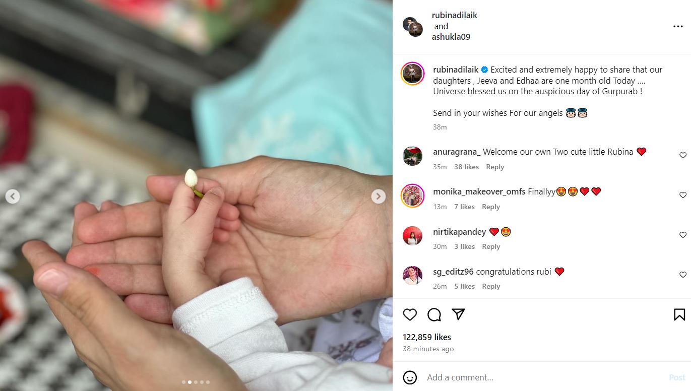 रुबीना और अभिनव ने इस पोस्ट को शेयर करने के साथ ही अपनी बेटियों के नाम भी बताए। टीवी के इस फेमस कपल ने अपनी बेटियों के नाम जीवा और एधा रखा है।