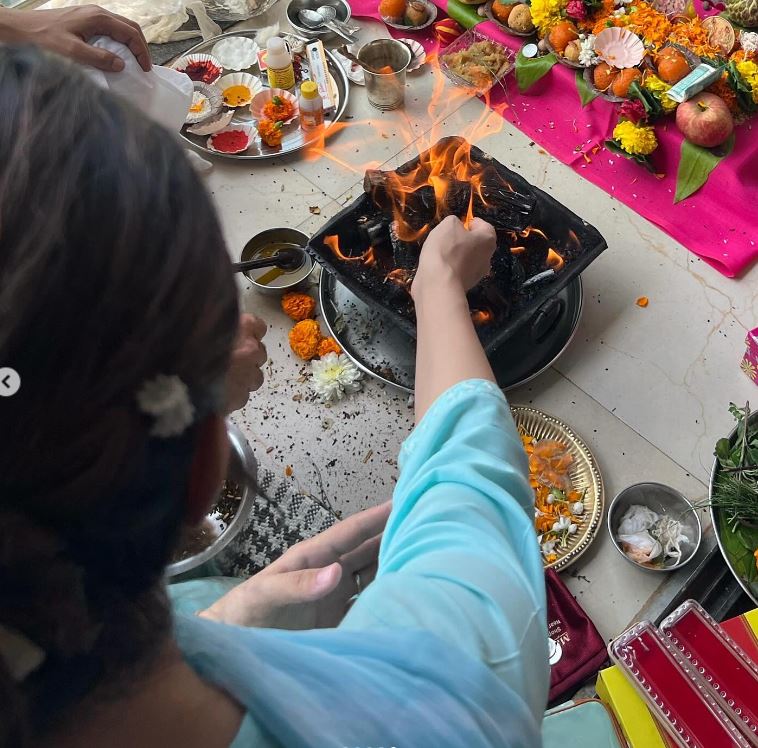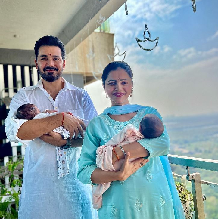 एक अन्य फोटो में वह और एक्टर अभिनव शुक्ला अपने घर बेटियों के जन्म के बाद पूजा पाठ करते हुए नजर आ रहे हैं।