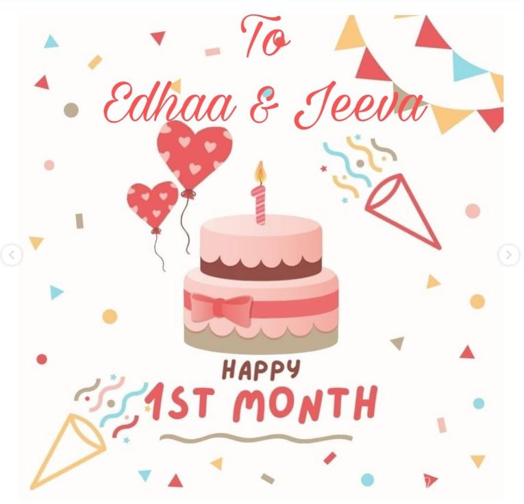उन्होंने फोटोज के साथ कैप्शन में लिखा, "हम ये शेयर करते हुए बहुत खुश और उत्साहित हैं कि हमारी बेटियां जीवा और एधा आज पूरे 1 महीने की हो चुकी हैं।