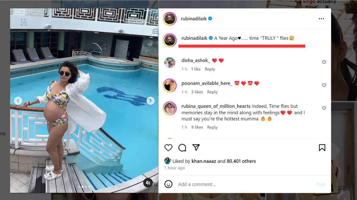 इन फोटो को देखकर दोबारा से उनके प्रेग्नेंट होने की अफवाह तेज हो गई। लेकिन एक्ट्रेस ने खुद कैप्शन में बताया है कि वह प्रेग्नेंट नहीं हैं, बल्कि ये थ्रोबैक तस्वीरें हैं, जो बीते साल प्रेग्नेंसी के दौरान उन्होंने क्लिक कराई थीं। इस पोस्ट के माध्यम से रुबीना ने पुराने समय को याद किया है और बताया है कि वक्त कितनी तेजी से बीतता है।