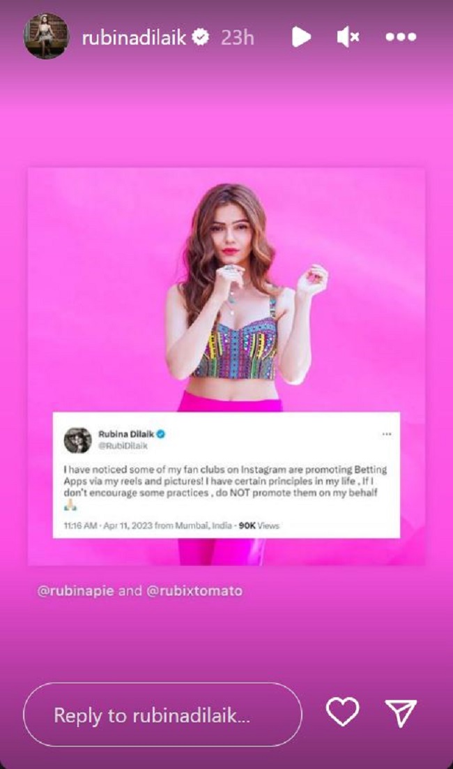 रुबीना दिलैक ने इंस्टाग्राम पर पोस्ट करते हुए लिखा है, 'मैंने कुछ नोटिस किया है। कुछ मेरे फैन क्लब इंस्टाग्राम पर बेटिंग ऐप का प्रमोशन कर रहे हैं। वैसा वे मेरे रील्स और पिक्चर्स के माध्यम से करते हैं। मेरे जीवन में कुछ सिद्धांत है अगर मैं कुछ चीजों का पालन नहीं करती हूं। तो मेरी ओर से कृपया उनका प्रचार ना करें। इसके साथ उन्होंने हाथ जोड़ने वाली इमोजी भी शेयर की है। इसपर कई लोगों ने प्रतिक्रिया भी दी है।