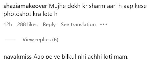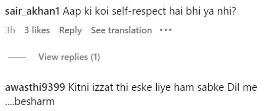 एक यूजर ने कहा, "वाहियात पहनकर हद पार कर दी।" एक ने कहा, "आपसे ऐसी उम्मीद नहीं थी मैम।" एक यूजर ने कमेंट किया, "यह जरूरी था क्या।" एक ने कहा, "आपको अनफॉलो करने का समय आ गया।" एक नेटिजन ने लिखा, "कोई काम दिला दो बेचारी को।" एक फैन ने कहा, "मैं आपका फैन हूं, लेकिन मुझे यह सब नहीं पसंद है।" एक यूजर ने कहा, "दिल से उतर गई छी।"