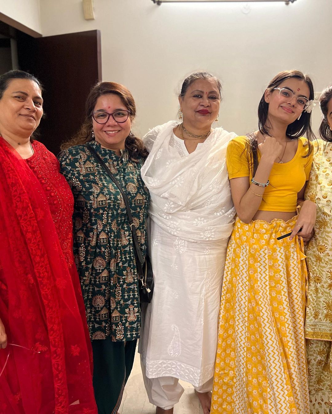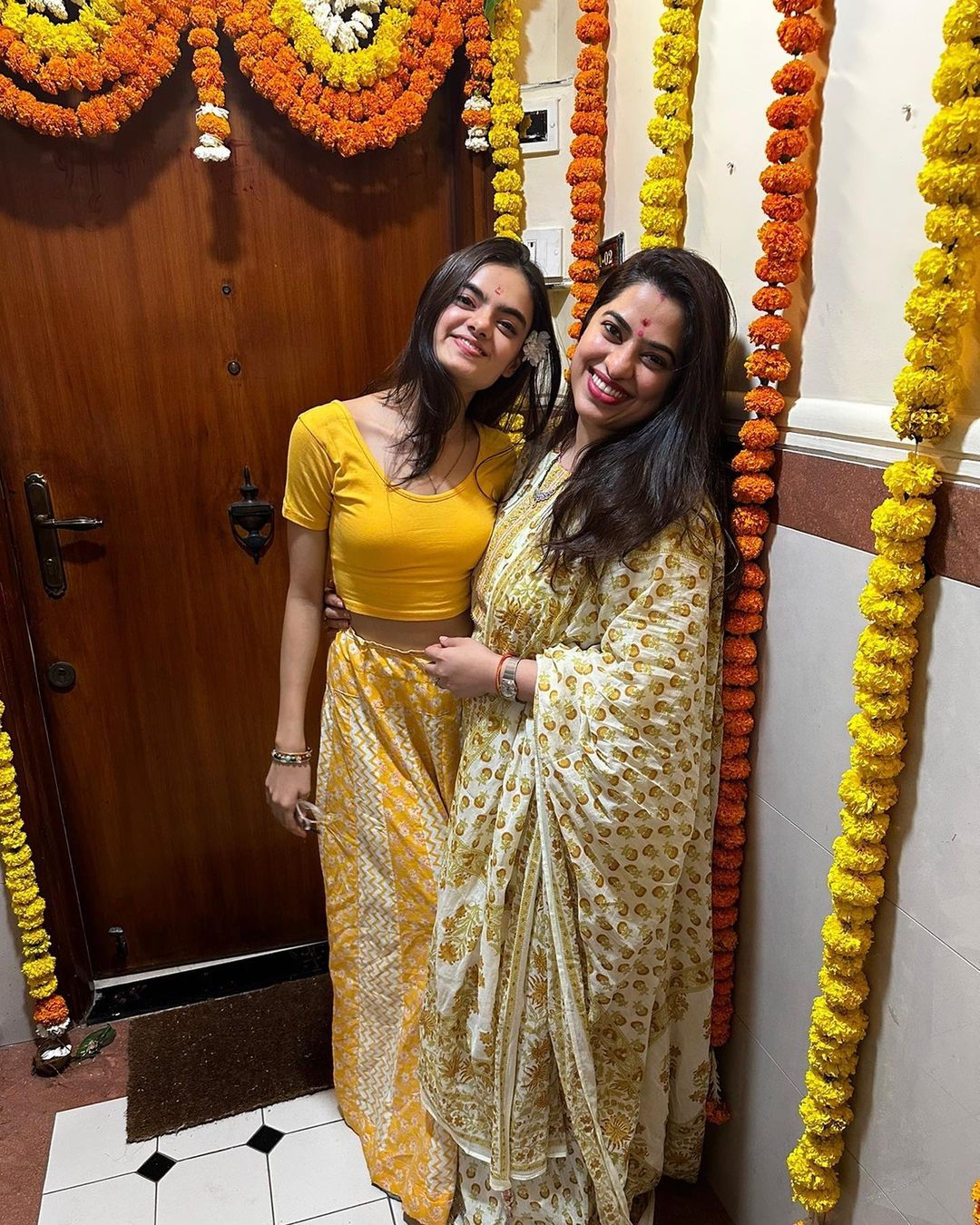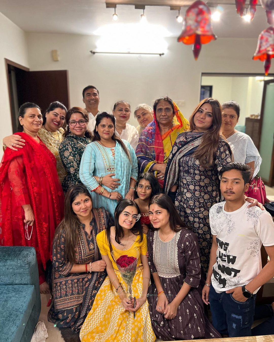 शेयर की गई तस्वीरों में एक्ट्रेस अपने परिवार वालों के साथ मस्ती के मूड में नजर आ रही हैं। घर के एंट्रेंस पर रुहानिका ने कजिन्स के साथ पोज देती दिखाई दे रही हैं, जिसे गेंदे के फूलों से सजाया गया है। इस मौके पर रुहानिका येलो कलर की ड्रेस में नजर आ रही हैं। उन्होंने प्लेन क्रॉप टॉप के साथ मैचिंग स्कर्ट पहना हुआ है, जिस पर सफेद प्रिंट भी नजर आ रहे हैं। उन्होंने अपने लुक को खूबसूरत नेकलेस और कुछ बीडेड ब्रेसलेट्स से एक्सेसरीज किया है।