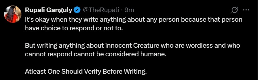 दरअसल रुपाली गांगुली ने अपने ऑफिशियल एक्स हैंडल पर एक लेटेस्ट ट्वीट करते हुए अपनी प्रतिक्रिया देते हुए कहा है-