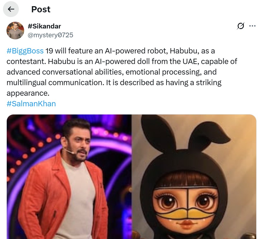 पढ़ने में शायद आपको अटपटा सा लगे लेकिन बिग बॉस 19, भारतीय रियलिटी टीवी पर यूएई की वायरल एआई डॉल हबूबू (Habubu) को ला सकता है। इंडिया फोरम की एक ताजा रिपोर्ट बताती है कि यूएई की यह पहली इंटरैक्टिव एआई रोबोट डॉल बिग बॉस के घर में 17 कंटेस्टेंट में से एक के रूप में प्रवेश करेगी। इस तरह से टीवी पर ऐसा पहली बार होगा जब किसी इंसान की जगह मशीन या एआई को जगह दी जाएगी।