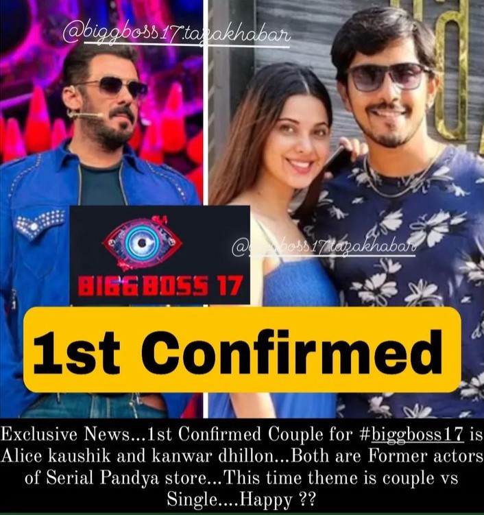 'बिग बॉस' की पल-पल की खबरें देने वाले फैन पेज ने इस बात की जानकारी दी है कि इस बार के शो के लिए तीन नाम कन्फर्म हो गए हैं। इनमे पहला नाम एलिस कौशिक (Alice Kaushik) और कंवर ढिल्लों (Kanwar Dhillon) का है। दोनों सीरियल 'पांड्या स्टोर' में काम कर चुके हैं। कवर ढिल्लों का नाम पिछले साल एक बार सुर्खियों में आया था, जब तुनिषा शर्मा की डेथ हो गई थी। कंवर और तुनिषा बहुत अच्छे दोस्त थे। तुनिषा की मौत पर उन्होंने अपनी दोस्त के लिए एक इमोशनल मेसेज लिखा था।