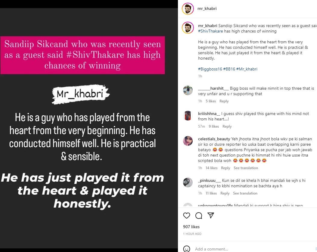 पिछले एपिसोड में शालीन और टीना के रिलेशन पर सवाल उठाने वाले संदीप सिकंद ने कहा कि शिव ठाकरे के बिग बॉस जीतने के चांस ज्यादा हैं। वह सच्चाई के साथ और दिल से गेम खेल रहे हैं। उन्होंने कहा कि शिव काफी प्रैक्टिकल और समझदार इंसान हैं।