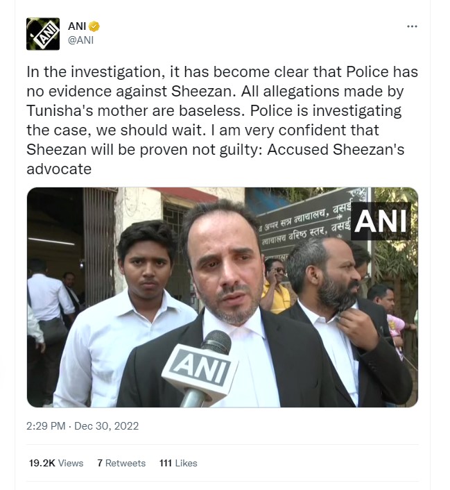 वकील शरद राय ने कहा, 'इन्वेस्टिगेशन में यह साफ हो गया है कि पुलिस को शीजान के खिलाफ कोई सबूत नहीं मिला है। तुनिषा की मां ने जो भी आरोप लगाए हैं, वह सब निराधार हैं। पुलिस मामले की जांच कर रही है, हमें इंतजार करना चाहिए। मैं बहुत कॉन्फिडेंट हूं कि शीजान बेकसूर साबित होगा।'