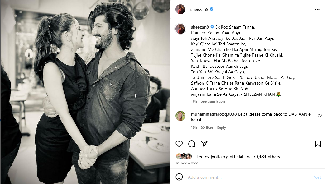 शीजान खान ने लिखा, ‘एक रोज शाम तन्हा, फिर तेरी कहानी याद आई, आई तो ऐसी आई के बस जान पर बन आई, केई किससे है तेरी बातों के, जमाने में चर्चे है अपनी मुलाकातों के, तुझे खोने का गम या तुझे पाने की खुशी, यही ख्याल है अब बोझल रातों के, कभी बा-दस्तूर आंख लगी, तो ये भी ख्याल आ गया, जो उमर तेरे साथ गुजर ना साकी उसपर मलाल आ गया, सफों की तरह चलते रहे करवातों के सिलसिले, आगाज ठीक से हुआ भी नहीं,अंजाम कहा से आ गया। शीजान खान ....।