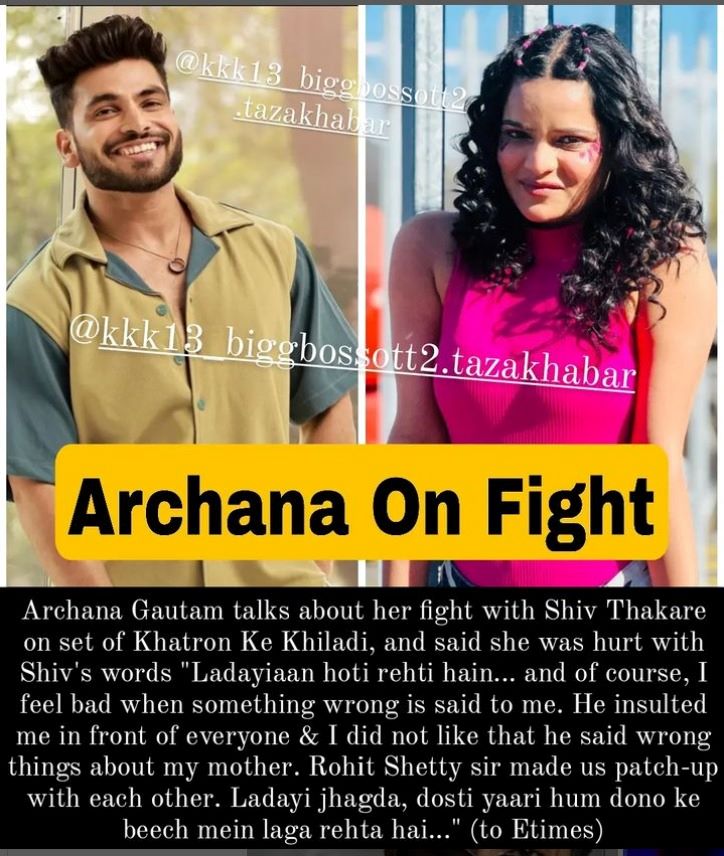 ई टाइम्स को दिए इंटरव्यू में इन दोनों ने अपनी दोस्ती और लड़ाई के बारे में बात की है। अर्चना गौतम ने बताया कि वह शिव की बातों से परेशान हो जाती हैं। लेकिन रोहित शेट्टी ने इनका पैचअप करवा दिया है। उन्होंने कहा कि लड़ाइयां होती रहती हैं, और जाहिर सी बात है कि मुझे बुरा भी लगता है। वह सबके सामने मेरी बेइज्जी करता है, और ये मुझे अच्छा नहीं लगता, जब वो मेरी मां के बारे में गलत चीजें बोलता है। लेकिन ठीक है। वह बातें अब पास्ट का हिस्सा बन चुकी हैं। रोहित सर ने हमारा पैचअप करवा दिया है।