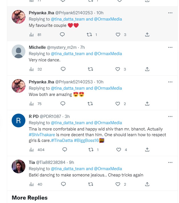 बिग बॉस हाउस में शिव के साथ टीना की नजदीकियां फैंस को शालीन-टीना की जोड़ी से ज्यादा पसंद आई है। कई फैंस ने शिव-टीना को फेवरेट कपल बताया। आरपीडी नाम के यूजर ने लिखा, 'टीना मिस्टर भनोट से ज्यादा शिव के साथ कंफरटेबल हैं। दरअसल, #ShivThakare शालीन से ज्यादा डीसेंट हैं। लोगों को शिव से यह सीखना चाहिए कि लड़कियों की इज्जत और केयर कैसे की जाती है। #TinaDatta #BiggBoss16'