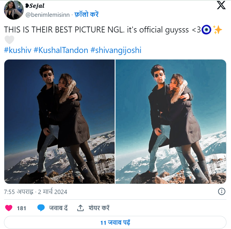 तस्वीरों में कुशाल टंडन और शिवांगी जोशी पहाड़ की वादियों में घूमते हुए नजर आए। इस तस्वीर में कुशाल ने शिवांगी के कंधे पर हाथ रखा हुआ है और साथ ही एक्ट्रेस के चेहरे की स्माइल देखते ही बन रही है। इस फोटो को शेयर करते हुए यूजर ने लिखा, "ये इनकी सबसे बेस्ट पिक्चर है, अब ऑफिशियल हो गया है"।