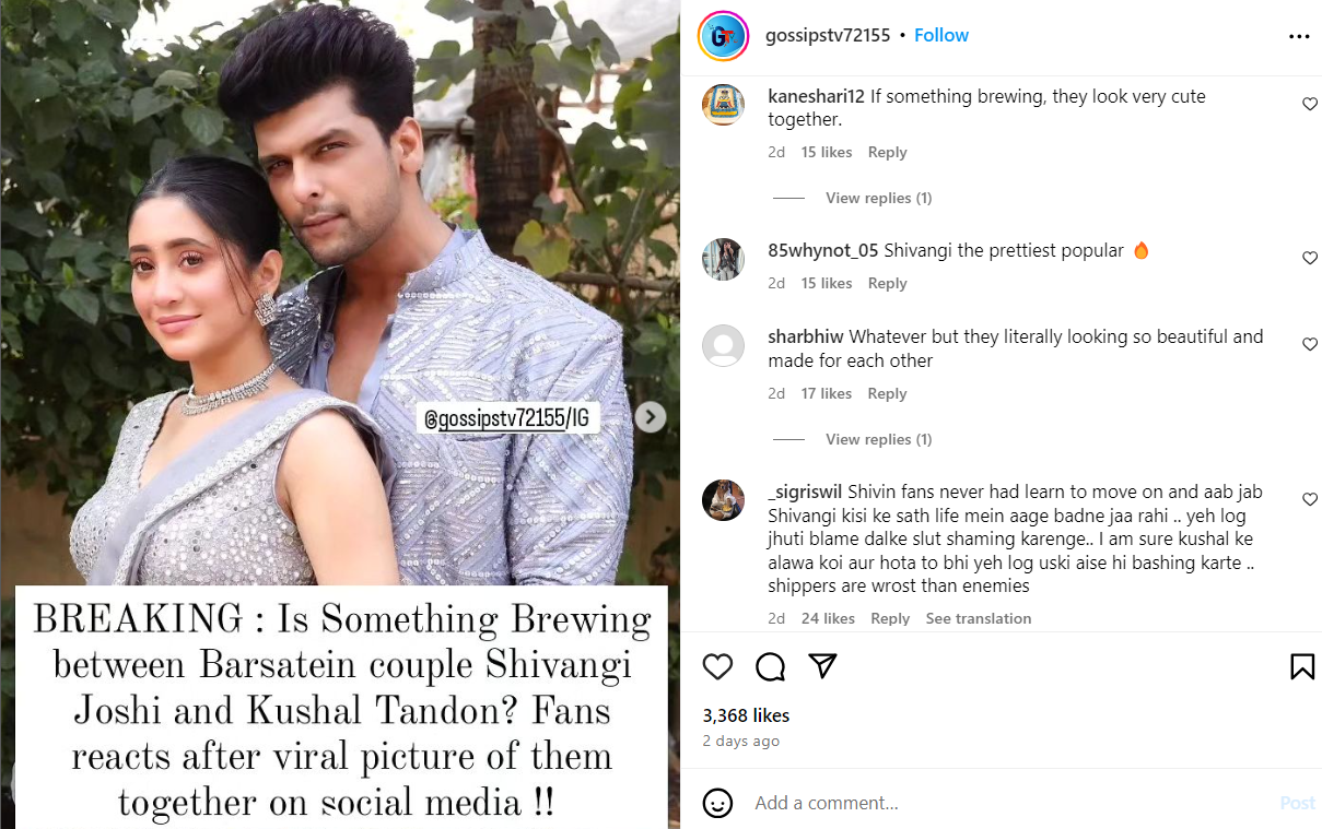 हालांकि, कुछ फैंस ये मानने के लिए तैयार नहीं हैं कि शिवांगी और कुशाल टंडन एक दूसरे को डेट कर रहे हैं। कुछ का तो ये भी कहना है कि अगर ये सच है, तो वह उनके लिए खुश हैं। एक यूजर ने कमेन्ट करते हुए लिखा, "अगर इनका कुछ चल रहा है, तो ये दोनों सच में एक-दूसरे के साथ अच्छे लगते हैं"।